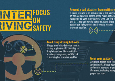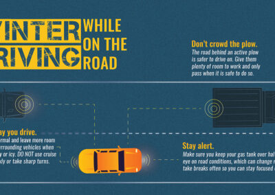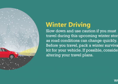 During winter it’s a good idea to always keep a bundle of cold-weather gear in your car. Pack snacks, water, a blanket, warm clothing, a flashlight, medications, a glass scraper, shovel, and other tools. Before hitting the road, remember to make sure your tires are properly inflated and have sufficient tread so that you can navigate potential ice or snow with ease. We want to ensure you have smooth travels, so we advise that you keep at least half of your car’s tank filled, don’t use cruise control when driving on a slippery surface, and avoid warming up your vehicle in enclosed areas, such as a garage.